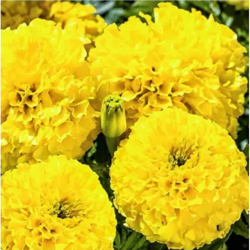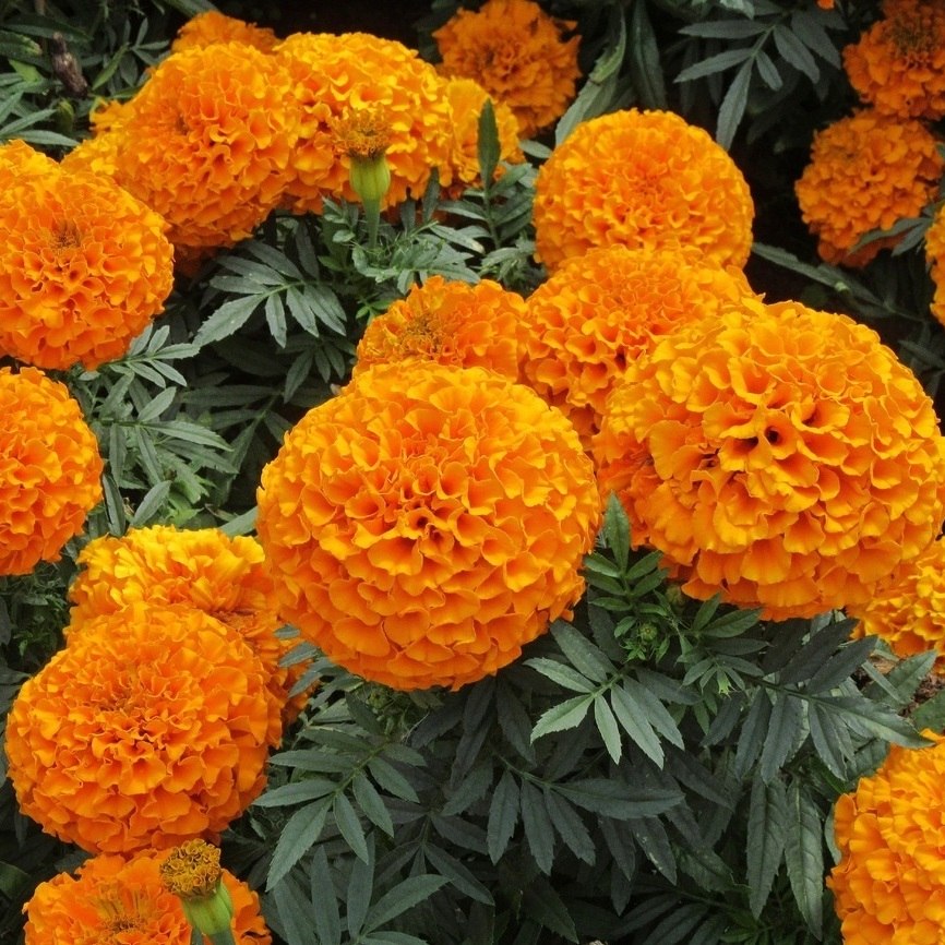 Бархатцы прямостоячие хризантемовидные серия Купид- шаровидный махровый сорт диаметром 9 см, высота куста 25 см.