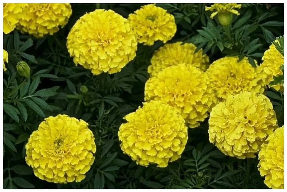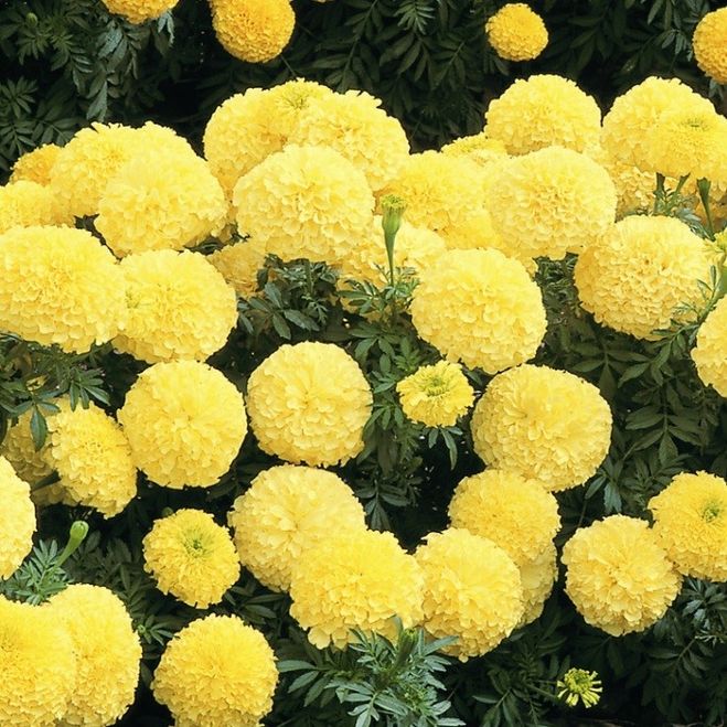 Тагетес лимонный - серия Петит, куст усыпан обилием красивых махровых цветков, диаметр цветка 5 см, высота куста 25 см.